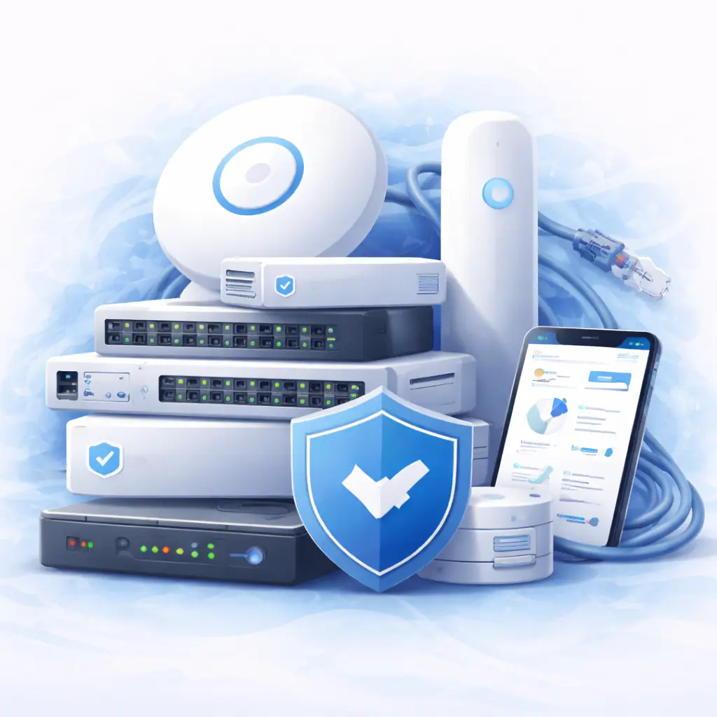 - UniFi gateways, switches, access points (indoor/outdoor)